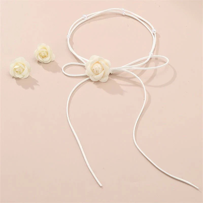 Denim Camellia Beaded Lace-up Necklace And Earrings Suite